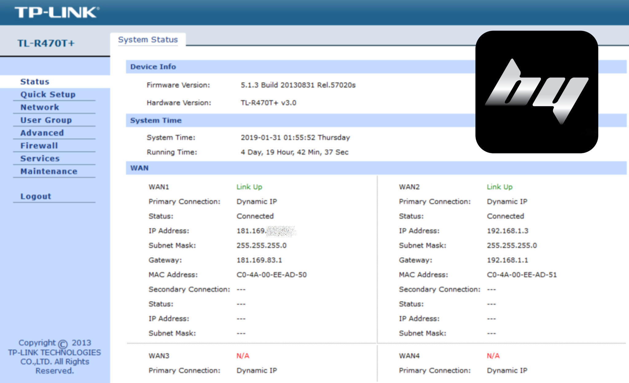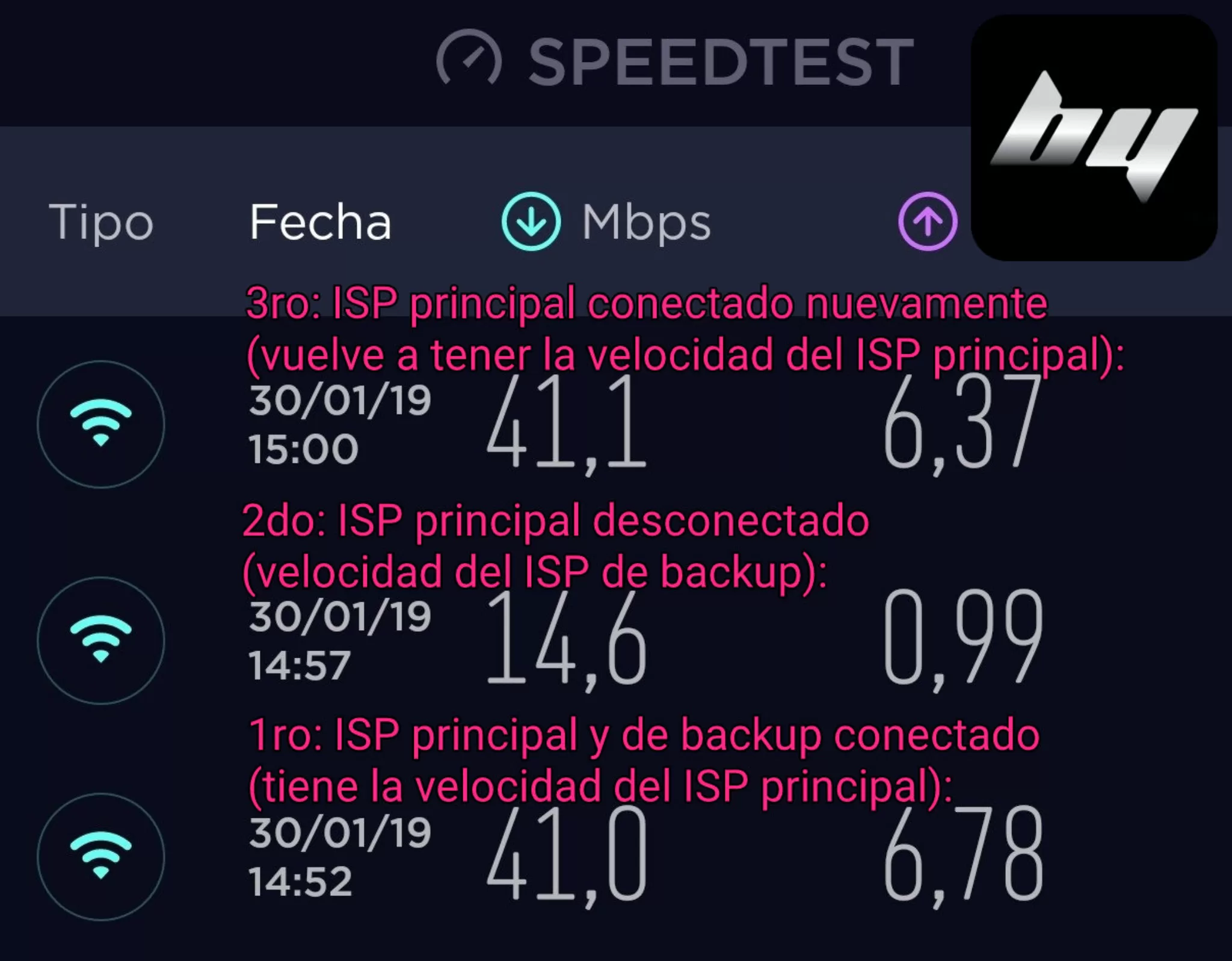 Esta empresa de venta online tenía problemas de conexión y velocidad de internet para resolver urgente en sus oficinas. Lo solucionamos realizando un servicio a domicilio para configurar de forma óptima, para la necesidad del cliente, el router que balanceaba los 2 proveedores de Internet (foto 1, 2 y 3). Por último verificamos el funcionamiento deseado, simulando una falla en el proveedor principal, desde los celulares (foto 4) y también de las PCs.
