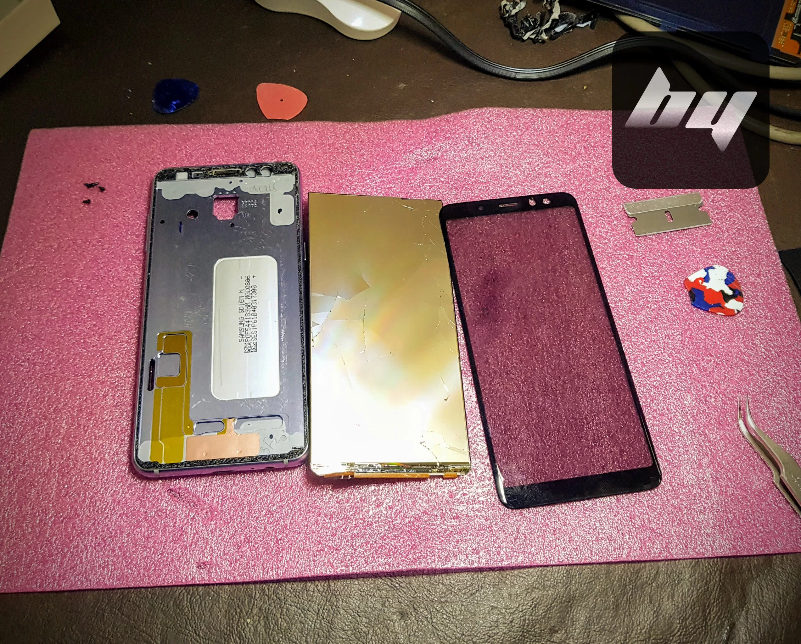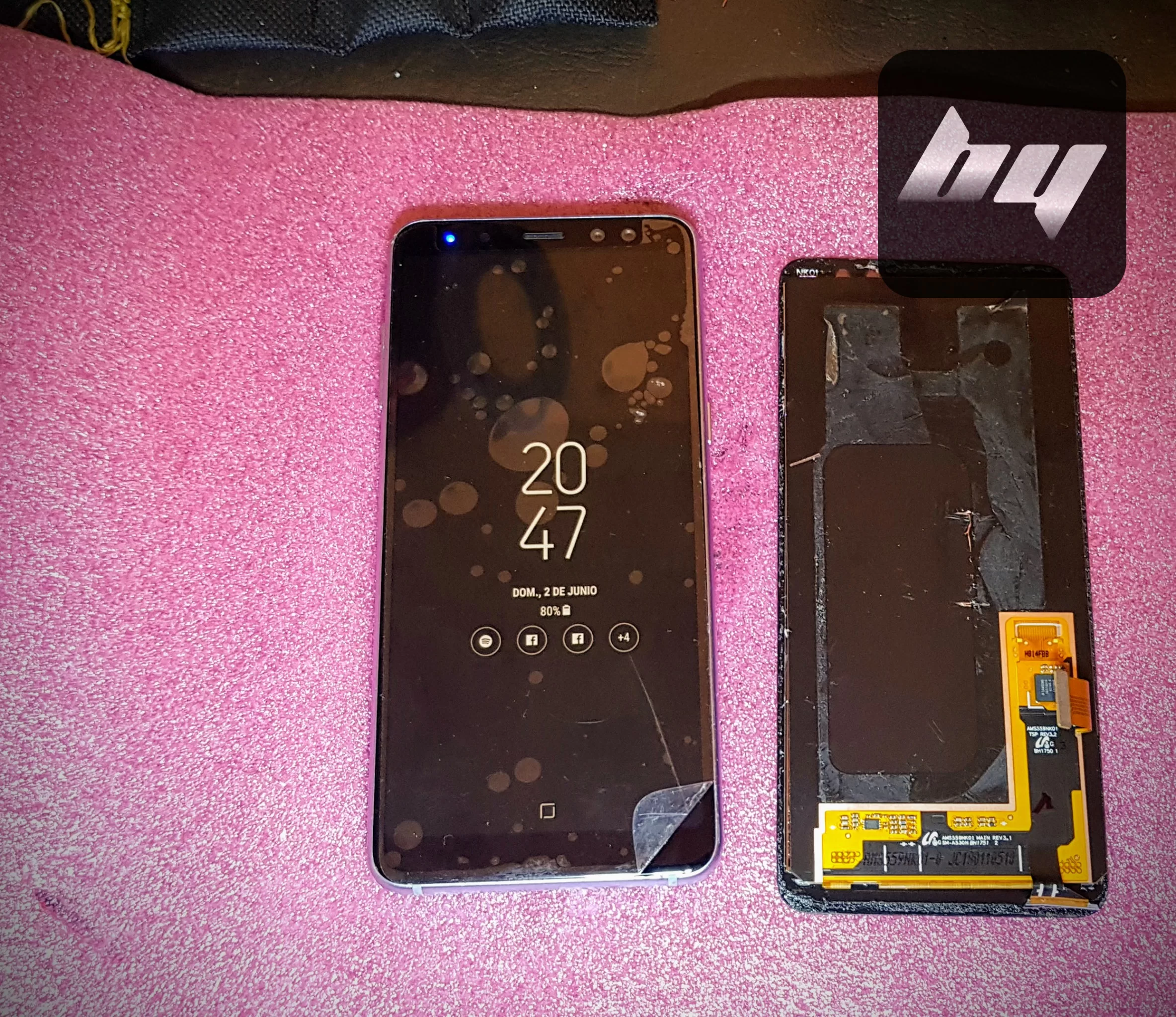 Este celular Samsung A8 no le funcionaba la pantalla debido a un golpe. Lo solucionamos reemplazando el módulo completo por uno original. Comenzamos removiendo el módulo dañado (foto 1), luego probando el funcionamiento del módulo nuevo (foto 2), una vez verificado realizamos la limpieza de los pegamentos viejos en el marco de la carcasa (foto 3) y por último armamos el equipo pegando el módulo nuevo (foto 4).