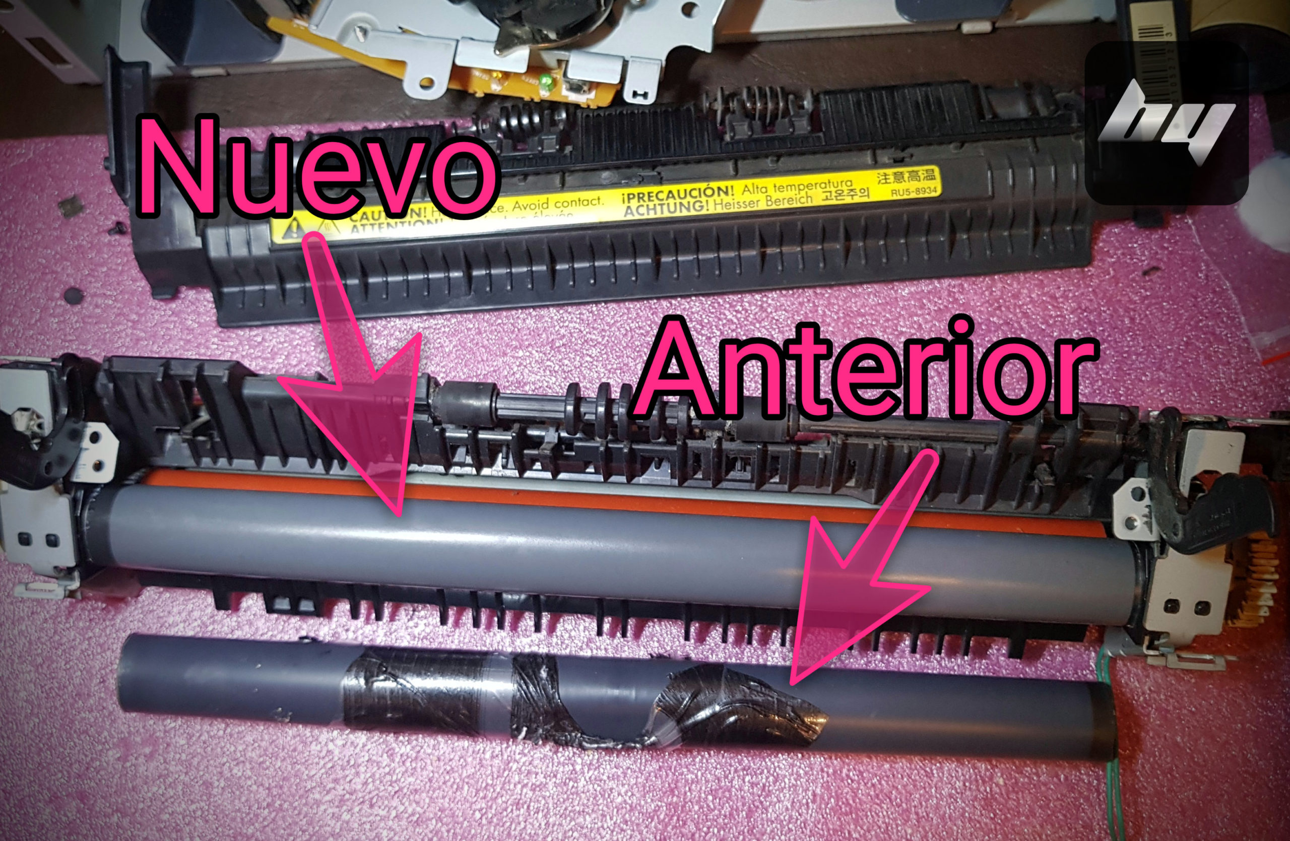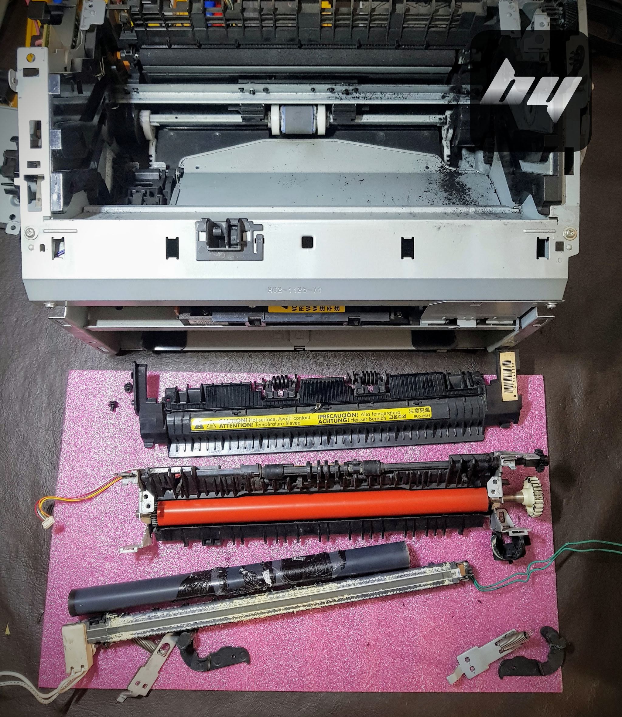 Esta impresora láser HP p1006 tenía dañado el fusor. Lo solucionamos desarmando el equipo (foto 1); limpiando y lubricando sus partes internas (foto 2); y reemplazando el repuesto (foto 3). Por último verificamos el funcionamiento y la calidad de impresión (foto 4).