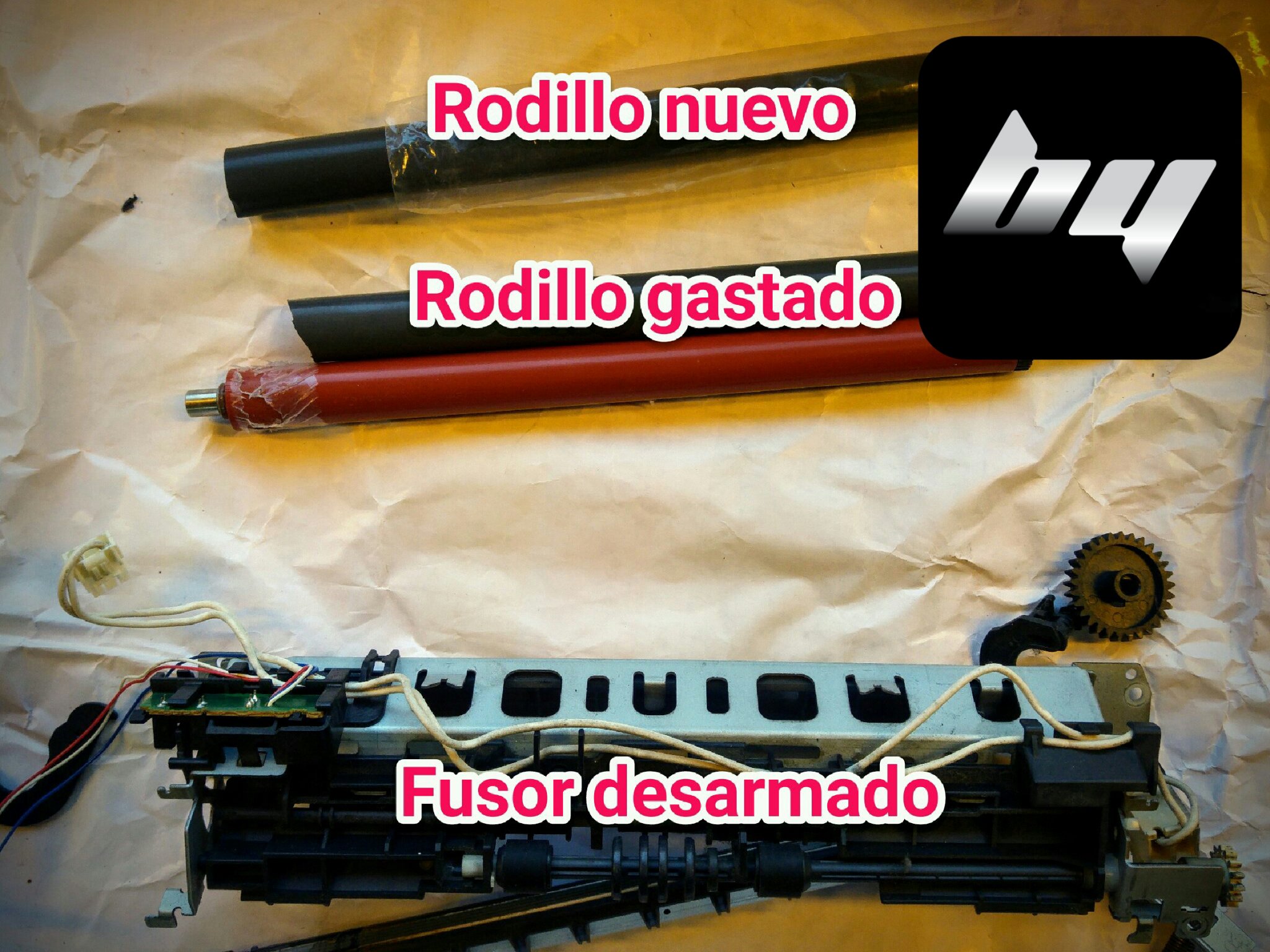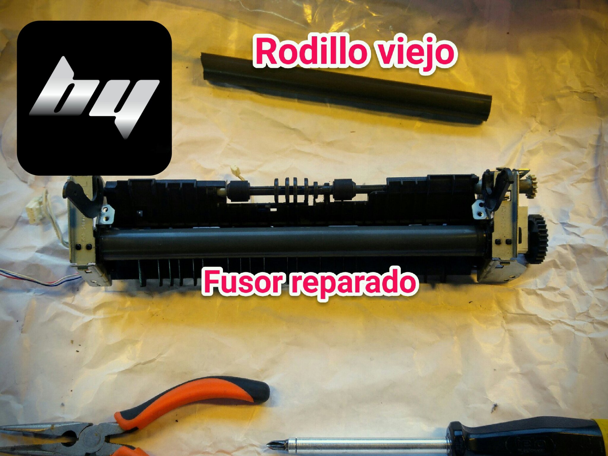 Esta impresora láser HP 1015 no fijaba bien el tóner y se trababa el papel a la salida. Lo solucionamos remplazando el film del fusor y realizando una limpieza interna completa y lubricando bujes y engranajes.